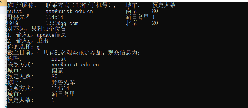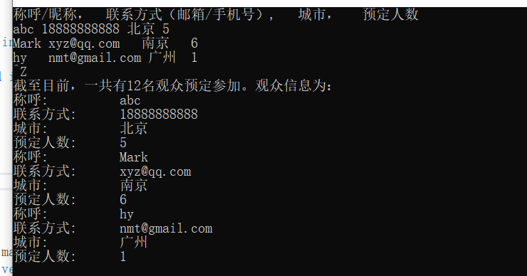 1 #include<iostream> 2 #include<string> 3 #include<vector> 4 #include<iomanip> 5 using namespace std; 6 7 class info { 8 private: 9 string nickname, contact, city; 10 int n; 11 12 public: 13 info() {} 14 info(string name, string con, string city, int n) :nickname(name), contact(con), city(city), n(n) { } 15 info(const info& obj) :nickname(obj.nickname), contact(obj.contact), city(obj.city), n(obj.n) { count++; } 16 ~info() { count--; } 17 void print()const; 18 static int count; 19 }; 20 21 int info::count = 0; 22 23 void info::print()const{ 24 25 26 cout <<left<< setw(15) << "称呼:" << nickname << endl; 27 cout <<left<< setw(15) << "联系方式:" << contact << endl; 28 cout << left << setw(15) << "城市:" <<city<< endl; 29 cout << left << setw(15)<<"预定人数:" <<n<< endl; 30 31 } 32 33 int main01() { 34 vector<info> audience_info_list(100); 35 const int capacity = 100; 36 string name, city, contact; 37 int num,i=0,people_num=0; 38 39 cout << "称呼/昵称, " << "联系方式(邮箱/手机号), " << "城市, " << "预定人数" << endl; 40 while (cin >> name >> contact >> city >> num) { 41 people_num += num; 42 if (people_num >capacity ) { 43 people_num -= num; 44 cout << "对不起,只剩" << capacity - people_num << "个位置" << endl; 45 cout << "1. 输入u,update信息" << endl << "2. 输入q,退出" << endl << "你的选择:"; getchar(); 46 char ch = getchar(); 47 if (ch == 'q')break; 48 else if (ch == 'u')continue; 49 else cout << "wrong input!"; 50 } 51 audience_info_list[i++] = { name,contact,city,num }; 52 } 53 cout << "截至目前,一共有" << people_num << "名观众预定参加。观众信息为:" << endl; 54 for (int t = 0; t <i ; t++) 55 audience_info_list[t].print(); 56 57 return 0; 58 }