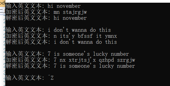 #include "textcoder.hpp" #include <iostream> #include <string> int main() { using namespace std; string text, encoded_text, decoded_text; cout << "输入英文文本: "; while (getline(cin, text)) { encoded_text = TextCoder(text).encoder(); // 这里使用的是临时无名对象 cout << "加密后英文文本:\t" << encoded_text << endl; decoded_text = TextCoder(encoded_text).decoder(); // 这里使用的是临时无名对象 cout << "解密后英文文本:\t" << decoded_text << endl; cout << "\n输入英文文本: "; } }