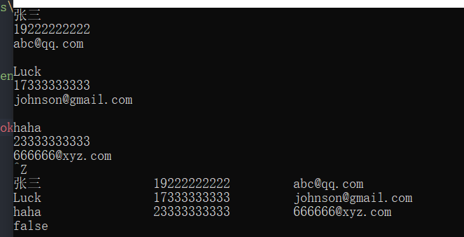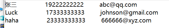 #include <iostream> #include <fstream> #include <vector> #include "Person.hpp" int main() { using namespace std; vector<Person> phone_book; Person p; while (cin >> p) phone_book.push_back(p); for (auto& i : phone_book) cout << i << endl; cout << boolalpha << (phone_book.at(0) == phone_book.at(1)) << endl; ofstream fout; fout.open("E:\\practices\\phone_book.txt"); if (!fout.is_open()) { cerr << "fail to open file phone_book.txt\n"; return 1; } for (auto& i : phone_book) fout << i << endl; fout.close(); }