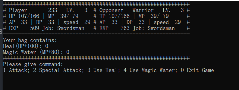 //======================= // main.cpp //======================= // main function for the RPG style game #include <iostream> #include <string> using namespace std; #include "swordsman.h" int main() { string tempName; bool success=0; //flag for storing whether operation is successful cout <<"Please input player's name: "; cin >>tempName; // get player's name from keyboard input player *human =NULL; // use pointer of base class, convenience for polymorphism int tempJob; // temp choice for job selection do { cout <<"Please choose a job: 1 Swordsman, 2 Archer, 3 Mage"<<endl; cin>>tempJob; system("cls"); // clear the screen switch(tempJob) { case 1: human=new swordsman(1,tempName); // create the character with user inputted name and job success=1; // operation succeed break; default: break; // In this case, success=0, character creation failed } }while(success!=1); // so the loop will ask user to re-create a character int tempCom; // temp command inputted by user int nOpp=0; // the Nth opponent for(int i=1;nOpp<5;i+=2) // i is opponent's level { nOpp++; system("cls"); cout<<"STAGE" <<nOpp<<endl; cout<<"Your opponent, a Level "<<i<<" Swordsman."<<endl; system("pause"); swordsman enemy(i, "Warrior"); // Initialise an opponent, level i, name "Junior" human->reFill(); // get HP/MP refill before start fight while(!human->death() && !enemy.death()) // no died { success=0; while (success!=1) { showinfo(*human,enemy); // show fighter's information cout<<"Please give command: "<<endl; cout<<"1 Attack; 2 Special Attack; 3 Use Heal; 4 Use Magic Water; 0 Exit Game"<<endl; cin>>tempCom; switch(tempCom) { case 0: cout<<"Are you sure to exit? Y/N"<<endl; char temp; cin>>temp; if(temp=='Y'||temp=='y') return 0; else break; case 1: success=human->attack(enemy); human->isLevelUp(); enemy.isDead(); break; case 2: success=human->specialatt(enemy); human->isLevelUp(); enemy.isDead(); break; case 3: success=human->useHeal(); break; case 4: success=human->useMW(); break; default: break; } } if(!enemy.death()) // If AI still alive enemy.AI(*human); else // AI died { cout<<"YOU WIN"<<endl; human->transfer(enemy); // player got all AI's items } if (human->death()) { system("cls"); cout<<endl<<setw(50)<<"GAME OVER"<<endl; delete human; // player is dead, program is getting to its end, what should we do here? system("pause"); return 0; } } } delete human; // You win, program is getting to its end, what should we do here? system("cls"); cout<<"Congratulations! You defeated all opponents!!"<<endl; system("pause"); return 0; }