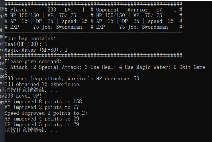 //======================= // player.cpp //======================= #include<iostream> #include"player.h" using namespace std; // character's HP and MP resume void player::reFill() { HP=HPmax; // HP and MP fully recovered MP=MPmax; } // report whether character is dead bool player::death() { return playerdeath; } // check whether character is dead void player::isDead() { if(HP<=0) // HP less than 0, character is dead { cout<<name<<" is Dead." <<endl; system("pause"); playerdeath=1; // give the label of death value 1 } } // consume heal, irrelevant to job bool player::useHeal() { if(bag.nOfHeal()>0) { HP=HP+100; if(HP>HPmax) // HP cannot be larger than maximum value HP=HPmax; // so assign it to HPmax, if necessary cout<<name<<" used Heal, HP increased by 100."<<endl; bag.useHeal(); // use heal system("pause"); return 1; // usage of heal succeed } else // If no more heal in bag, cannot use { cout<<"Sorry, you don't have heal to use."<<endl; system("pause"); return 0; // usage of heal failed } } // consume magic water, irrelevant to job bool player::useMW() { if(bag.nOfMW()>0) { MP=MP+100; if(MP>MPmax) MP=MPmax; cout<<name<<" used Magic Water, MP increased by 100."<<endl; bag.useMW(); system("pause"); return 1; // usage of magic water succeed } else { cout<<"Sorry, you don't have magic water to use."<<endl; system("pause"); return 0; // usage of magic water failed } } // possess opponent's items after victory void player::transfer(player &p) { cout<<name<<" got"<<p.bag.nOfHeal()<<" Heal, and "<<p.bag.nOfMW()<<" Magic Water."<<endl; system("pause"); bag.set(bag.nOfHeal() + p.bag.nOfHeal(), bag.nOfMW() + p.bag.nOfMW()); // set the character's bag, get opponent's items } // display character's job void player::showRole() { switch(role) { case sw: cout<<"Swordsman"; break; case ar: cout<<"Archer"; break; case mg: cout<<"Mage"; break; default: break; } } // display character's job void showinfo(player& p1, player& p2) { system("cls"); cout<<"##############################################################"<<endl; cout<<"# Player"<<setw(10)<<p1.name<<" LV. "<<setw(3) <<p1.LV <<" # Opponent"<<setw(10)<<p2.name<<" LV. "<<setw(3) <<p2.LV<<" #"<<endl; cout<<"# HP "<<setw(3)<<(p1.HP<=999?p1.HP:999)<<'/'<<setw(3)<<(p1.HPmax<=999?p1.HPmax:999) <<" | MP "<<setw(3)<<(p1.MP<=999?p1.MP:999)<<'/'<<setw(3)<<(p1.MPmax<=999?p1.MPmax:999) <<" # HP "<<setw(3)<<(p2.HP<=999?p2.HP:999)<<'/'<<setw(3)<<(p2.HPmax<=999?p2.HPmax:999) <<" | MP "<<setw(3)<<(p2.MP<=999?p2.MP:999)<<'/'<<setw(3)<<(p2.MPmax<=999?p2.MPmax:999)<<" #"<<endl; cout<<"# AP "<<setw(3)<<(p1.AP<=999?p1.AP:999) <<" | DP "<<setw(3)<<(p1.DP<=999?p1.DP:999) <<" | speed "<<setw(3)<<(p1.speed<=999?p1.speed:999) <<" # AP "<<setw(3)<<(p2.AP<=999?p2.AP:999) <<" | DP "<<setw(3)<<(p2.DP<=999?p2.DP:999) <<" | speed "<<setw(3)<<(p2.speed<=999?p2.speed:999)<<" #"<<endl; cout<<"# EXP"<<setw(7)<<p1.EXP<<" Job: "<<setw(7); p1.showRole(); cout<<" # EXP"<<setw(7)<<p2.EXP<<" Job: "<<setw(7); p2.showRole(); cout<<" #"<<endl; cout<<"--------------------------------------------------------------"<<endl; p1.bag.display(); cout<<"##############################################################"<<endl; }
