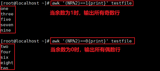 awk '(NR%2)==1{print}' testfile   #输出所有奇数行的内容