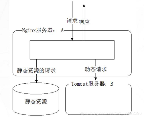服务端接收来自客户端的请求中。既有静态资源也有动态资源,静态资源由Nginx提供服务,动态资源Nginx转发至后端