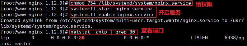1 make && make install 2 3 ln -s /usr/local/nginx/sbin/nginx /usr/local/sbin/ 4 5 vim /lib/systemd/system/nginx.service 6 [Unit] 7 Description=nginx 8 After=network.target 9 [Service] 10 Type=forking 11 PIDFile=/usr/local/nginx/logs/nginx.pid 12 ExecStart=/usr/local/nginx/sbin/nginx 13 ExecrReload=/bin/kill -s HUP $MAINPID 14 ExecrStop=/bin/kill -s QUIT $MAINPID 15 PrivateTmp=true 16 [Install] 17 WantedBy=multi-user.target 18 19 chmod 754 /lib/systemd/system/nginx.service 20 systemctl start nginx.service 21 systemctl enable nginx.service