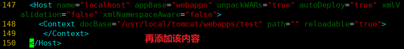 1 vim /usr/local/tomcat/conf/server.xml 2 #由于主机名 name 配置都为 localhost,需要删除前面的 HOST 配置 3 <Host name="localhost" appBase="webapps" unpackWARs="true" autoDeploy="true" xmlValidation="false" xmlNamespaceAware="false"> 4 <Context docBase="/usr/local/tomcat/webapps/test" path="" reloadable="true"> 5 </Context> 6 </Host> 7 8 /usr/local/tomcat/bin/shutdown.sh 9 /usr/local/tomcat/bin/startup.sh