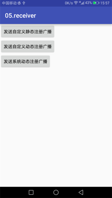 下面这个Demo,界面如下,注册两个动态接收器(接收自定义广播和系统广播)和注册静态广播(接收自定义静态和广播、手机USB的插拔事件、接收短信并读取短信息)