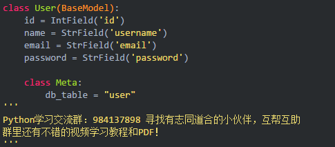从上面的User类中,我们看到StrField和IntField,从字段意思上看,我们很容易看出这代表两个字段类型。字段名分别是id,username,email,password。