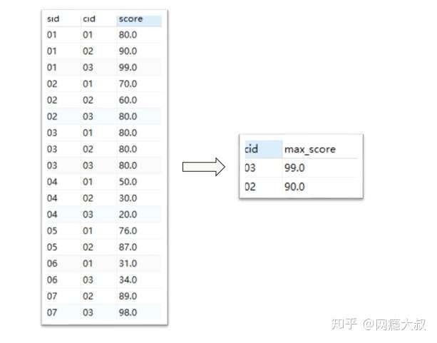 max(score) –搭配group by子句使用的聚合函数,表示每门课的最高成绩