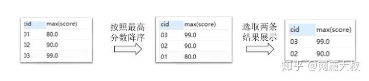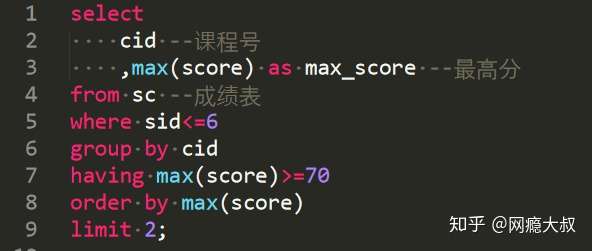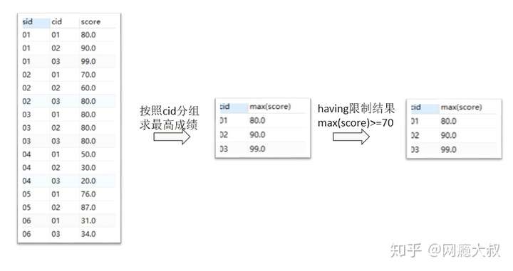 回顾一下执行顺序,首先我们用where子句对原始数据做了学号id需要小于等于6的限制。然后我们用group by和max(score)聚合函数实现了对课程进行分层,求出每门课的最高成绩,为了对聚合之后的结果作限制,我们用having子句只展示最高分数大于等于70的记录。
