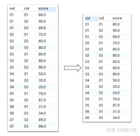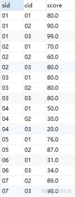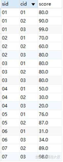 为方便阅读,下面列出被查询的成绩表sc和查询后的结果: