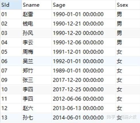 SId 学生编号,Sname 学生姓名,Sage 出生年月,Ssex 学生性别