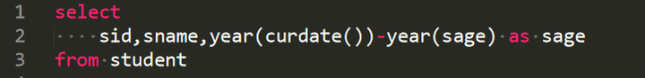 - ,year(curdate())-year(sage) as age ##当前年份减去出生年份得到年龄