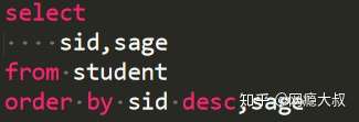 例如:查询学生id和年龄,并先按照学号sid降序,再按照年龄sage升序排列
