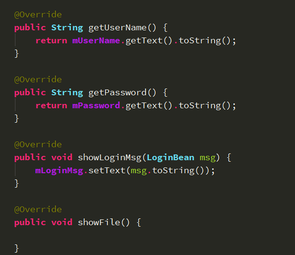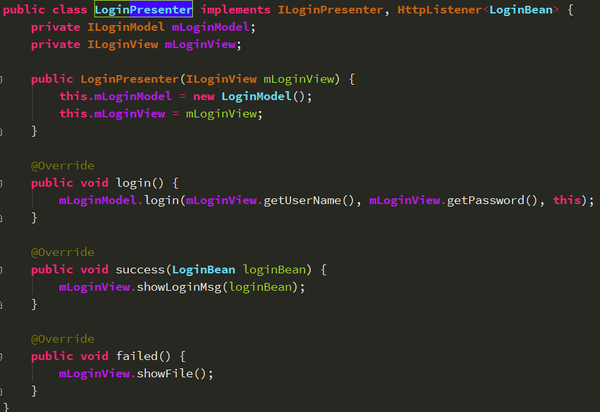 这边是我LoginActivity需要实现的代码,是不是蛮简单,activity的代码一目了然。View层的代码都在这儿了,下面来看一看presenter层的代码。