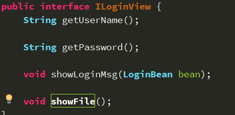 这是我定义的View层的接口,分别获取用户名,用户密码,以及展示登陆成功和登陆失败的信息,以及网络请求失败的信息,View层,是我们与用户交互的界面,那便让LoginActivity来实现它,从写上面的方法。