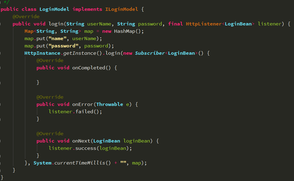 model层,用于具体的逻辑实现,当然,还是一个login方法,传入用户名,密码,以及HttpListener的实现类,这个大家应该都能看懂,login 方法中,就是我们的具体网络请求,好现在我们们来聊聊Rxjava 加Retrofit的简单使用,还是贴代码。