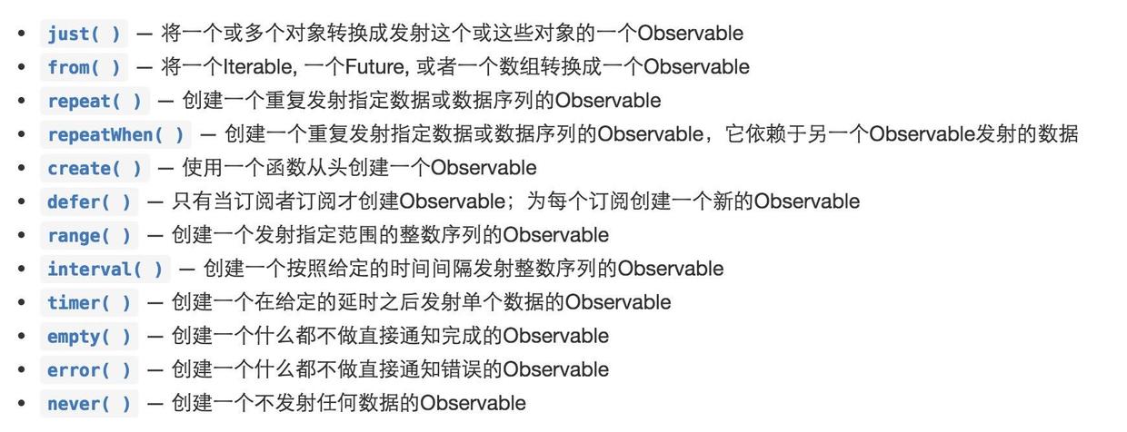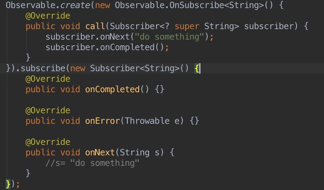 123456Observable.create(new Observable.OnSubscribe<String>() {public void call(Subscriber<? super String> subscriber) {subscriber.onNext("create success");}});- Observable.just( T1 t1, T2 t2, T3 t3,…)