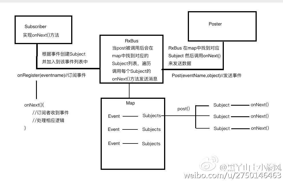 123456789PublishSubject<Object> subject = PublishSubject.create();// observer1 will receive all onNext and onCompleted eventssubject.subscribe(observer1);subject.onNext("one");subject.onNext("two");// observer2 will only receive "three" and onCompletedsubject.subscribe(observer2);subject.onNext("three");subject.onCompleted();再想想EventBus的原理,我们所需要的正是这样一个“热”Observable。这里是较为复杂的一种实现,先上原理图