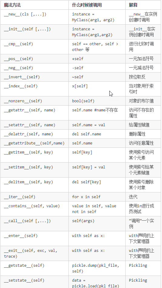 通过这两个例子相信你已经对Python的魔法方法比较理解了,但是Python中的魔法方法远不止两三个,而在官方文档中,也没有一个比较详细的归纳,所以这里参考译文(在此文的最后部分)做一个简单的汇总,希望大家可以根据这个汇总的表单对其中的魔法方法进行尝试,下次再看到这样的用法也就不足为奇了。