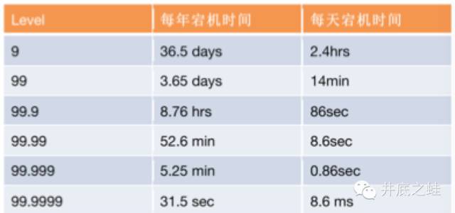 业界高可用的目标是几个9,对于每一个系统的要求是不一样的,对研发人员来说,要对设计或者开发的系统知道其用户规模及使用场景,知道可用性的目标。