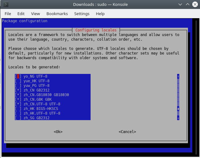使用方向键移动,空格键选择,Tab 键切换位置。除过默认选中的 en_US.UTF-8,还要选择与中文有关的四个选项,选择OK。