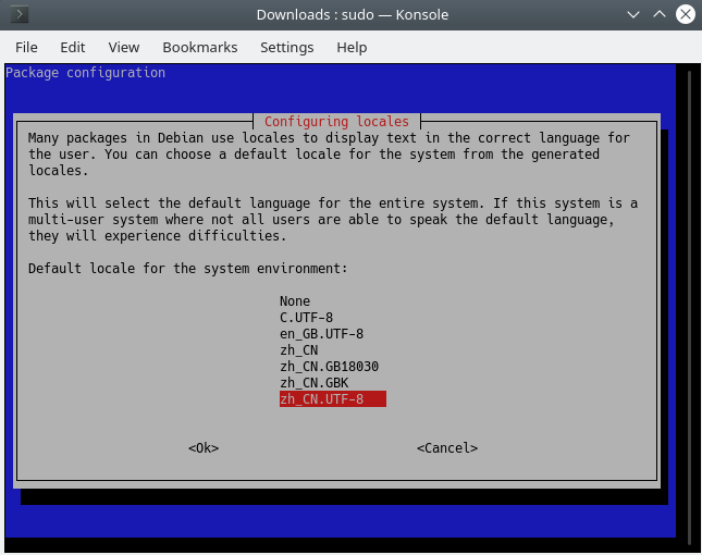 在下图中选择 zh_CN.UTF-8 并确定。