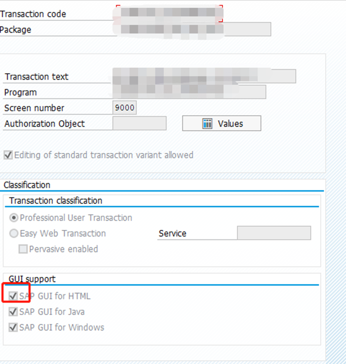 Step2.SE93创建事务码,GUI support 勾选 SAP GUI for HTML