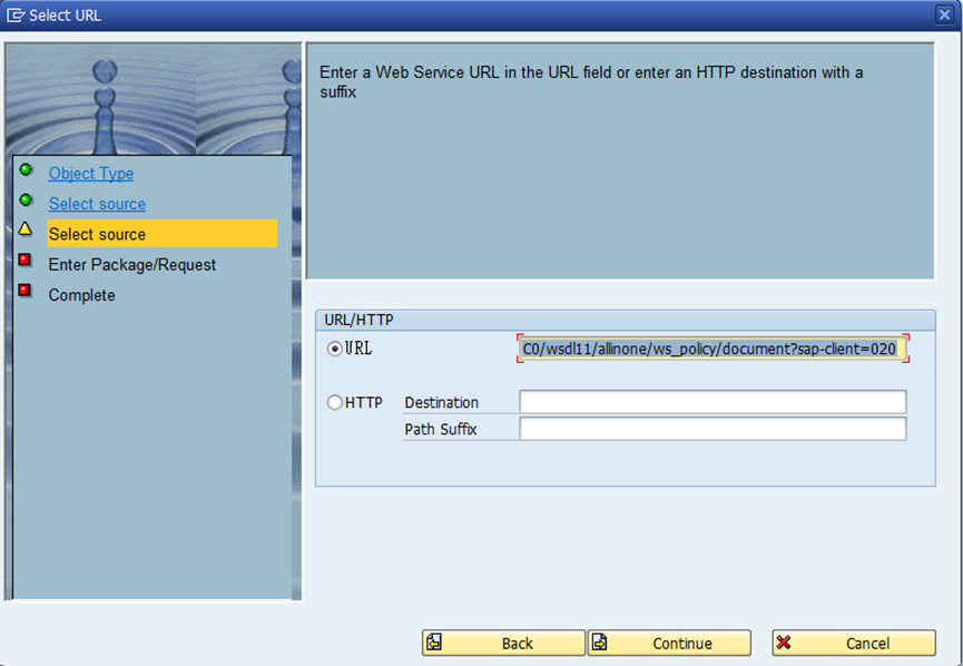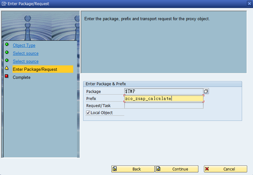 填写Prefix信息,勾选Local Object复选框,将对象保存到本地,否则录入相应的package和Request/Task,点击继续按钮。