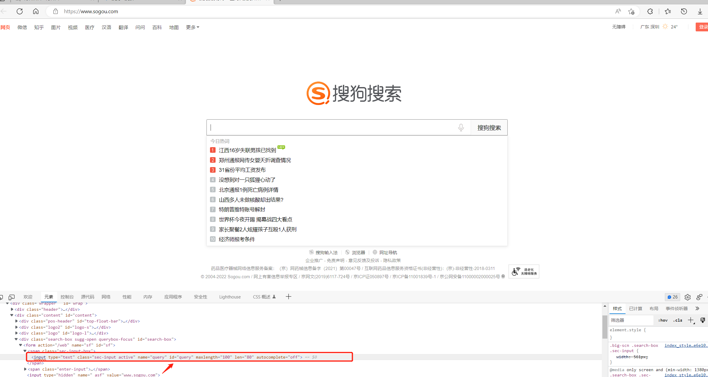 2、定位元素,定位搜狗的输入框的ID,先进入输入框内容清除,再输入”久曲健 博客园“,并回车
