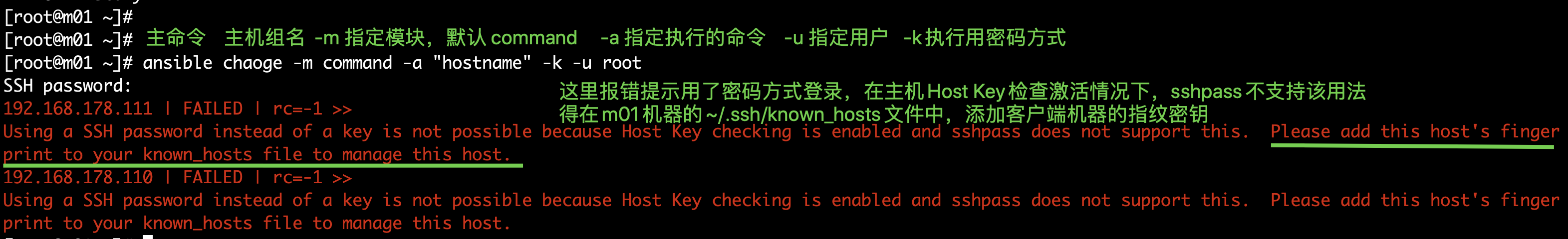 1.在m01机器,执行ansible命令批量远程管理 [root@m01 ~]# ansible chaoge -m command -a "hostname" -k -u root SSH password: 192.168.178.111 | FAILED | rc=-1 >> Using a SSH password instead of a key is not possible because Host Key checking is enabled and sshpass does not support this. Please add this host's fingerprint to your known_hosts file to manage this host. 192.168.178.110 | FAILED | rc=-1 >> Using a SSH password instead of a key is not possible because Host Key checking is enabled and sshpass does not support this. Please add this host's fingerprint to your known_hosts file to manage this host.