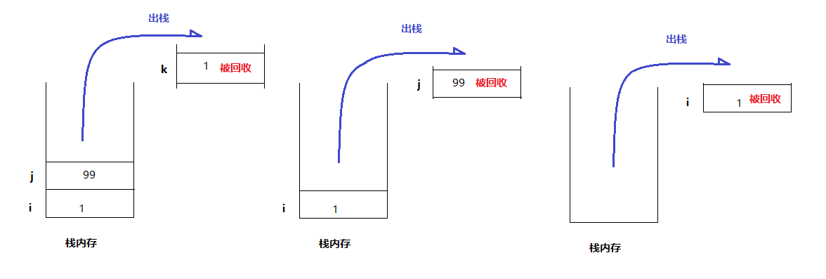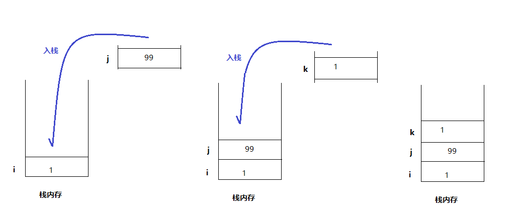 变量i, j , k是基本数据类型,在声明时就能确定它的内存大小,它们是值类型变量,数据项直接存储在栈上。