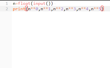 编写一个程序,计算输入数字N的0次方到5次方结果,并依次输出这6个结果,输出结果间用空格分隔。其中:N是一个浮点数。 print()函数可以同时输出多个信息,采用如下方法可以使用空格对多个输出结果进行分割:print(3.14, 1024, 2048)