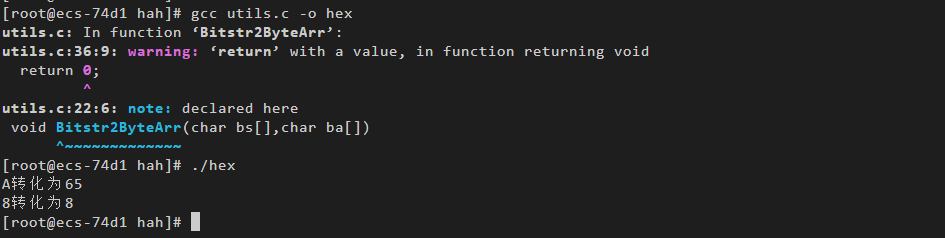 #include <stdio.h> #include <string.h> #include "utils.h" char Hex2Char(int i){ if(i>=0 && i<= 9) return i + 0x30; // return i + '0' if(i>=10 && i<=15) return i + 0x37; //return i + 'A' - 10; } int Char2Hex(char x){ if(x>48&&x<58) return x-48; if(x>65&&x<75) return x - 55; }