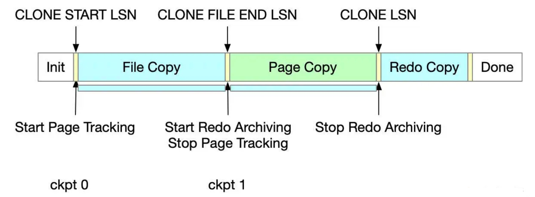 所有被修改的页发送完成后,就从page copy状态变成redo copy状态;在clone lsn位置停止redo archiving;clone lsn是被克隆的数据库的lsn,在这个位置可以获取复制的位置;clone lsn是开启复制前,提交的最后一个事务;在redo copy阶段,发送归档的redo日志文件,lsn介于clone file end lsn到clone lsn之间