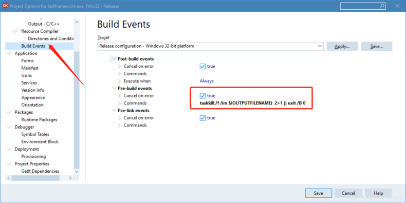 命令参数如下:taskkill /f /im $(OUTPUTFILENAME) 2>1 || exit /B 0