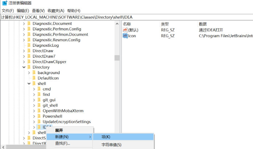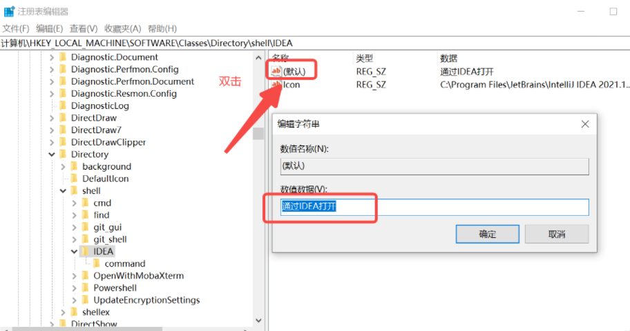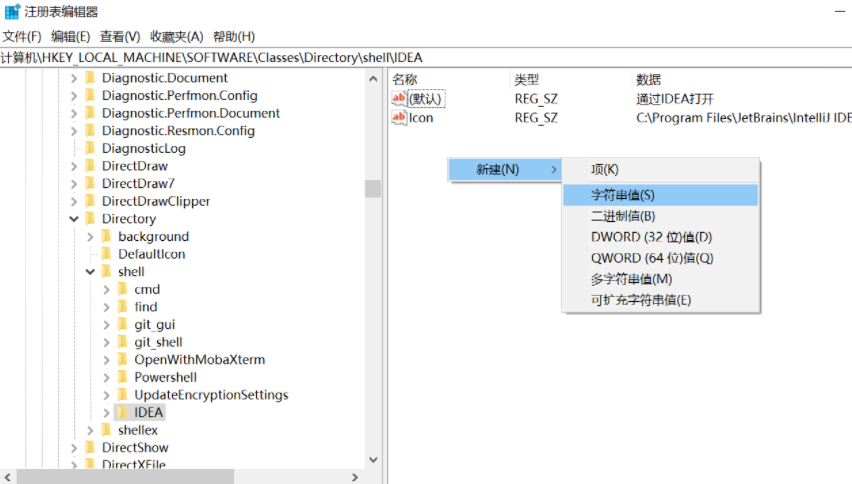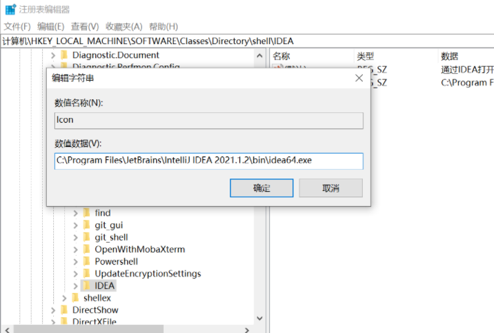 3. 在IDEA里,新建字符串值,起名Icon,数值数据为你的idea路径: