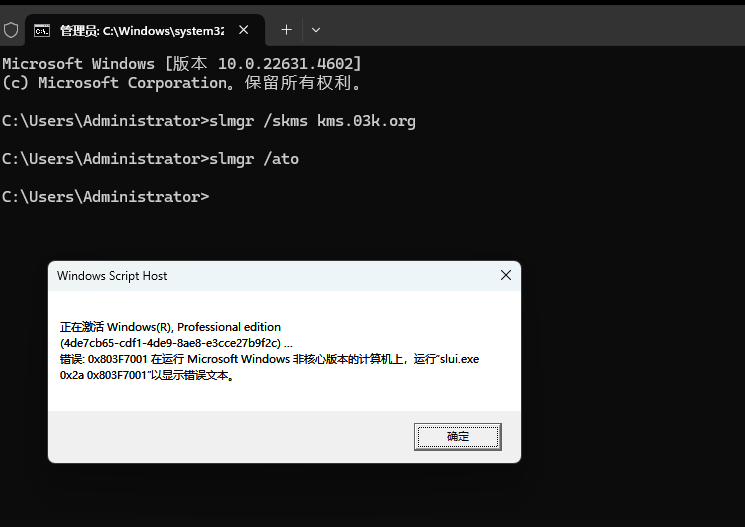 # slmgr -ipk 序列号:替换“序列号”为你有效的 Windows 10 产品密钥 如: slmgr -ipk W269N-WFGWX-YVC9B-4J6C9-T83GX