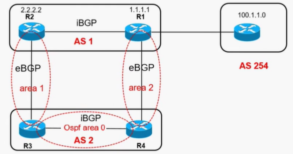 R3 从R2 /R4 分别学到100.1.1.0 BGP路由,优选R2 (E >I)