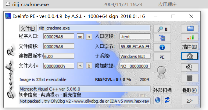 exeinfo查壳,未发现壳,是VC++5.0编写的32位程序