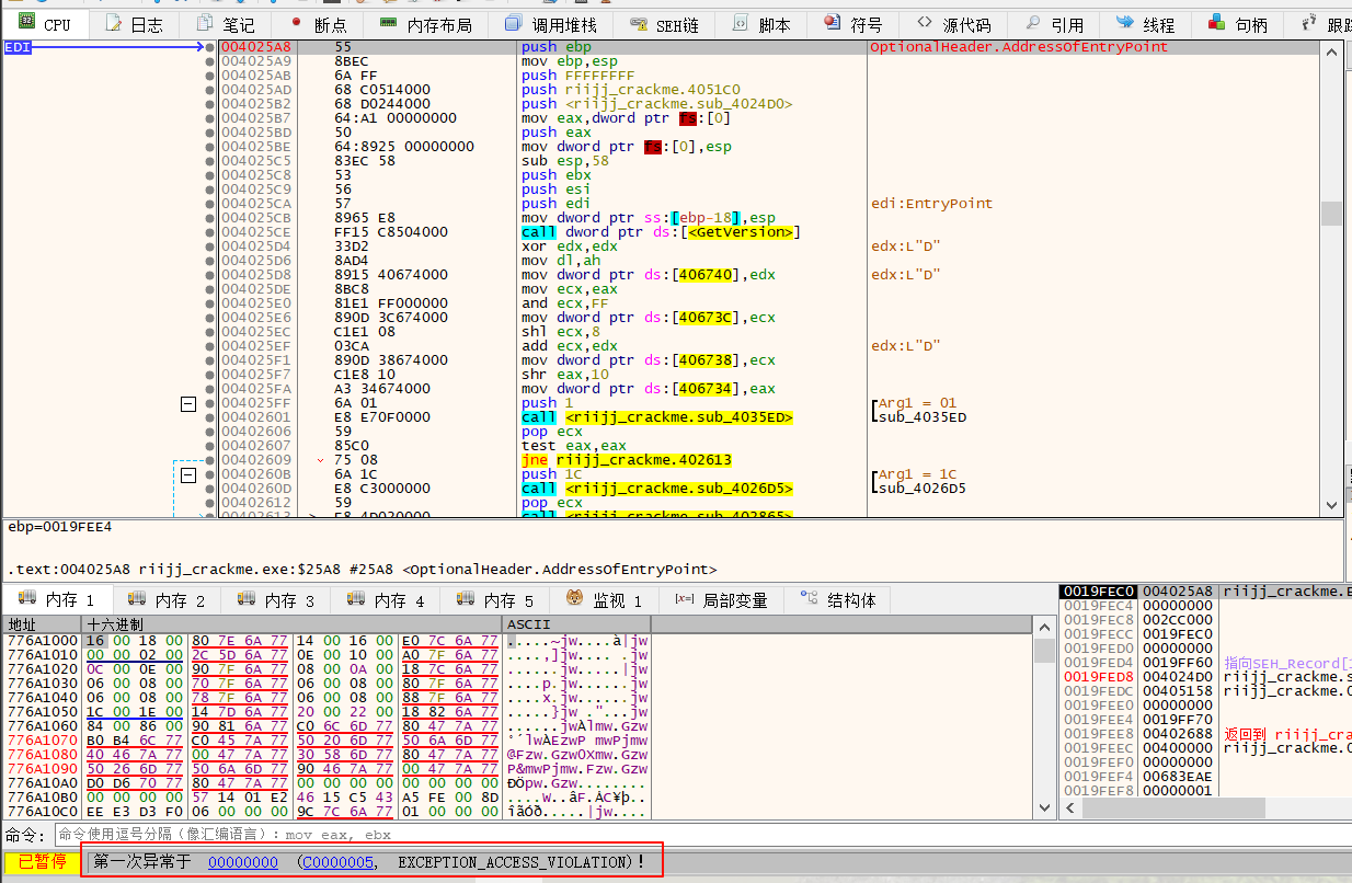 ,这个地址访问不了导致了异常之后停止,猜测这是反调试手段。