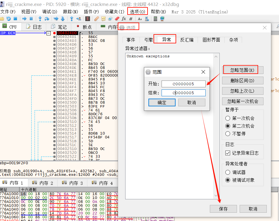 选项->选项->异常,设置忽略范围点击保存