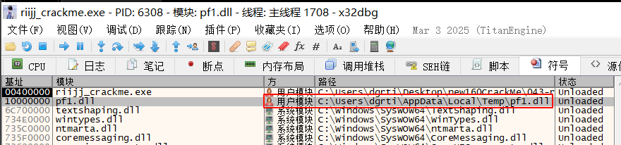 F9让程序运行起来,点击符号,双击进入pf1.dll