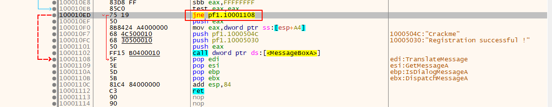 100010C6 | 75 1E | jne pf1.100010E6 | ; 不相等则跳过比较过程