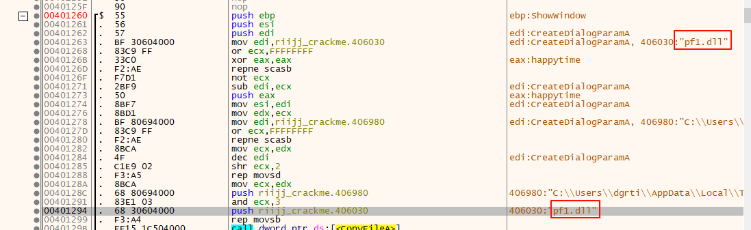 我们需要先找到这个解密程序块,跟踪字符串pf1.dll