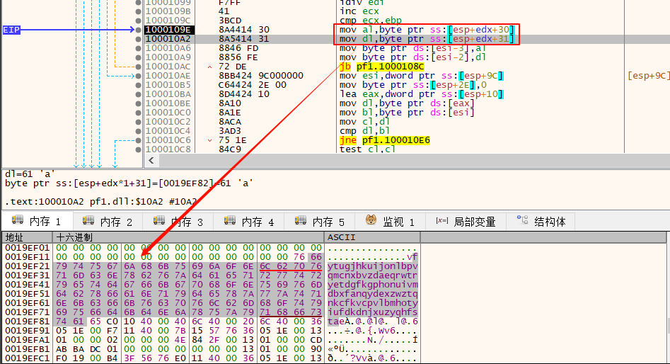 100010CC | 8A50 01 | mov dl,byte ptr ds:[eax+1] | ; 下面是一样的,逐字符比较