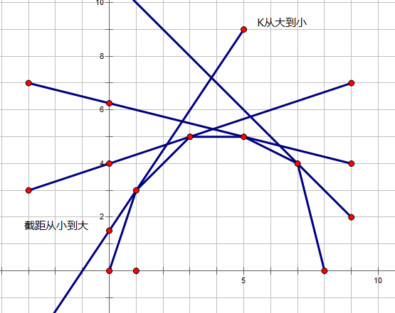 假设一条斜率为 \(-k\) 的直线,从 \(y\) 轴正方向,远离 \(x\) 轴的地方逐渐向凸包连线递减,直到与任意凸包相切,可以发现随着 \(-k\) 的逐渐变小,相切点逐渐向 \(x\) 轴正方向移动,那么我们可以按照 \(-k\) 从大到小进行排序,利用单指针从左向右扫描,可以 \(O(n)\) 求出答案。