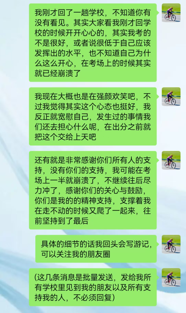 令我感动的是真的有很多人,很认真的回了我,不仅他们考完以后回的这些信息,其实考前考后都有更多的人在以各种方式支持着我。