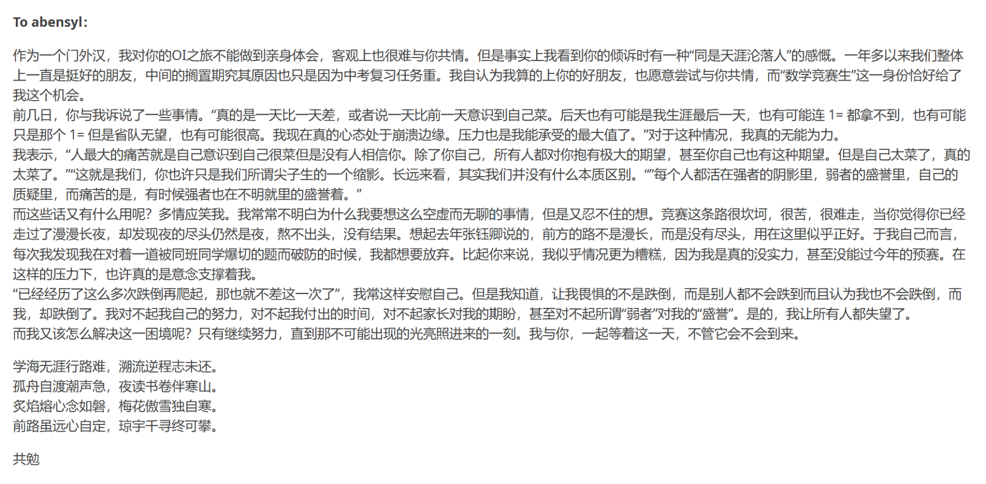 CSP-S 我考的很高,但这真的是我的实际水平吗?我考的又足够高吗?不!这反而还给我带来了很大的压力,分数比我低的 OIer 们暗地里想把我比下去,其他不参加 OI 的也不懂 OI 的朋友们、老师们也对我期望很高。