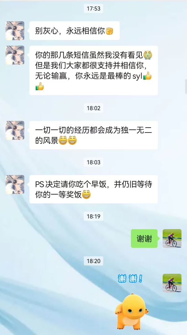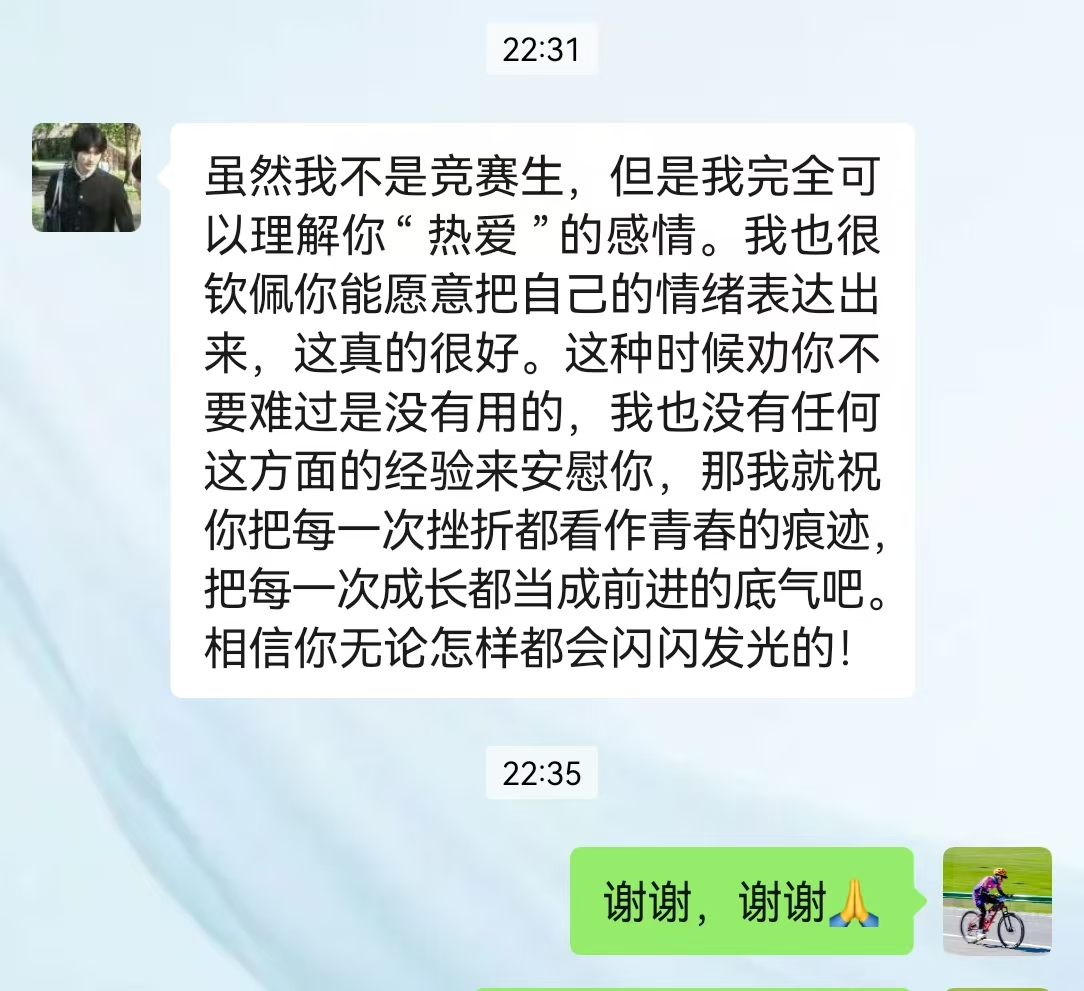 我求助了刘昆老师,我向他讲述了我的状态和情况,他说让我欣赏自己,找回信心,一定可以的。后来又跟带队老师马老师讲述了一下我的情况,马老师也是各种夸我,希望我能够找回信心,肯定了我的实力,让我相信自己。我都听下了。