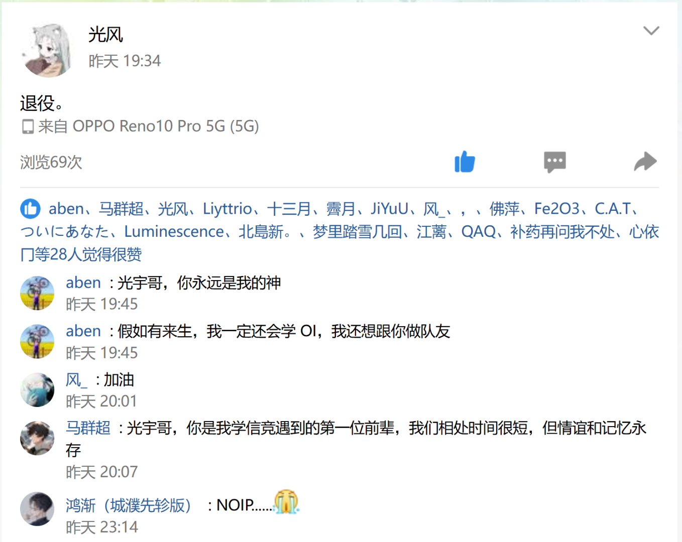 今年 NOIP 以后,OI 要告一段落了,如果可以重进省选,我或许会在省选前训练一下,剩下的时间,就处在半退役状态吧。